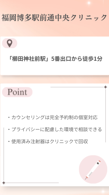 ただし、毎回の通院に時間がかかりやすい点や、診察料が別途1,000〜3,000円前後かかるケースもあるため、継続コストとして見込んでおく必要があります。博多・天神エリア以外にお住まいの方は、通院負担も考慮してクリニックを選びましょう。